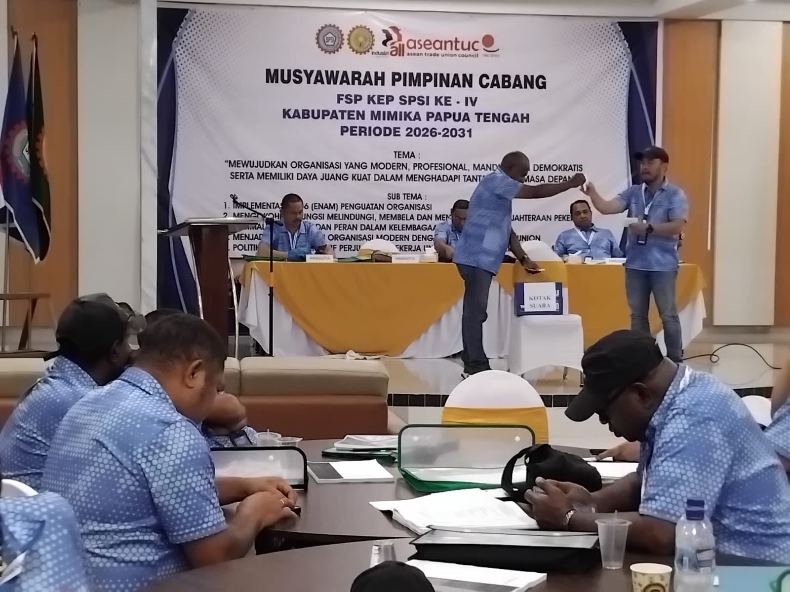 PENGHITUNGAN SUARA – Prosesi penghitungan suara pemilihan Ketua PC FSP KEP SPSI dalam Muscab ke-IV PC SPSI Kabupaten Mimika di Ballroom Hotel Kanguru, Jumat (27/2/2026). (FOTO:MAURITS/TIMEX)