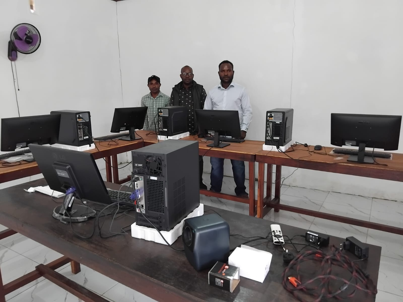 FOTO BERSAMA – Elly Dolame, Maico Gobay dan Gilbert Faith selaku pendiri YHPC Mimika, foto bersama di ruangan kursus komputer YHPC di Jalan Leo Mamiri. (FOTO: MAURITS SADIPUN)