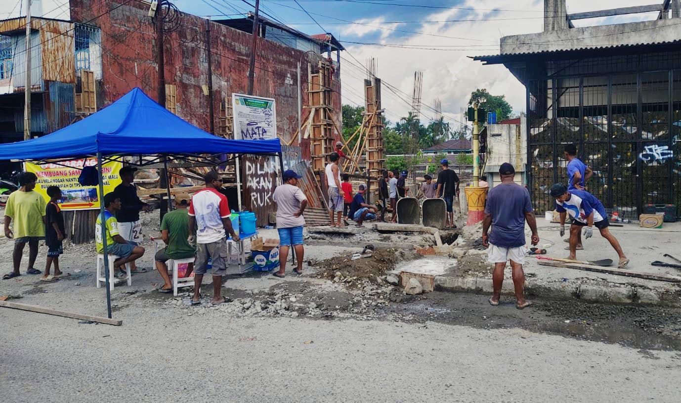 GOTONG-ROYONG -Warga Jalan Swadaya, belakang Bengkel Surabaya Motor, Timika, bergotong royong membangun drainase sementara untuk mengatasi genangan air yang sempat viral. (Foto: Mega Irianti/TIMEX)
