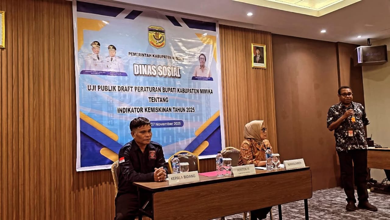TIMIKA, TIMIKAEXPRESS.id – Dinas Sosial Kabupaten Mimika, Provinsi Papua Tengah, menggelar uji publik draft Peraturan Bupati (Perbup) tentang indikator kemiskinan tahun 2025 di Hotel Front One, Jalan Hasanuddin, Jumat (7/11/2025).