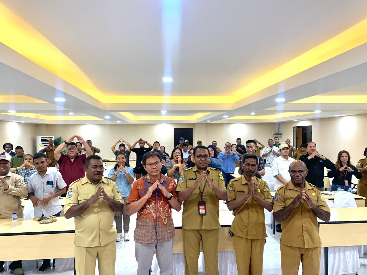 FOTO BERSAMA – Asisten III Bidang Administrasi Setda Mimika, Evert Lukas Hindom, didampingi Ketua Komisi Hukum dan Perundang-undangan Dewan Pers RI, Abdul Manan, foto bersama insan pers usai sosialisasi Permenkominfo No. 4 Tahun 2024 di Hotel Grand Tembaga, Senin (10/11). (FOTO: GREN/TIMEX)