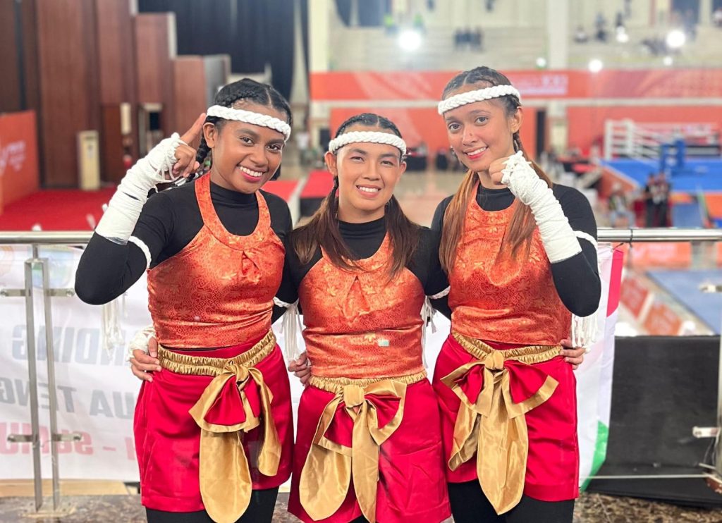 FOTO KETERANGAN: Fitria Juwita dan Ayu Shakira menyumbangkan Medali Perak pada kategori Seni Muay Boran Putri Hulda Elisabeth Sroyer, Fitria Juwita, dan Prisillia Yuliana Sahelangi meraih Medali Perak pada kategori Seni Muay Aerobic Putri. Medali perunggu diraih oleh Roger Palungan, Alinus Waker, dan Marsel O. Lagiaduay pada kategori Seni Muay Aerobic Putra. (FOTO: PTFI/TIMEX)