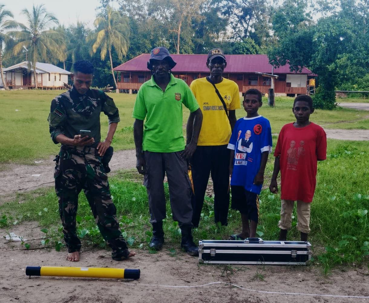 PENCARIAN – Personel Satgas TMMD Kodim 1710/Mimika melakukan pencarian titik sumber air menggunakan alat geolistrik di Kampung Keakwa. (Foto: IST/TIMEX)