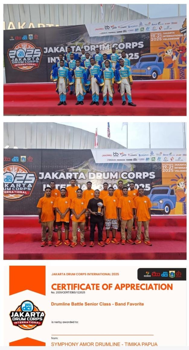 TIMIKA, timikaexpress.id – Tim Marching Band Symphony Amor asal Timika mencetak prestasi membanggakan dalam ajang Jakarta Drum Corps International (JDCI) 2025 yang digelar pada 20 Desember 2025 di Jakarta.