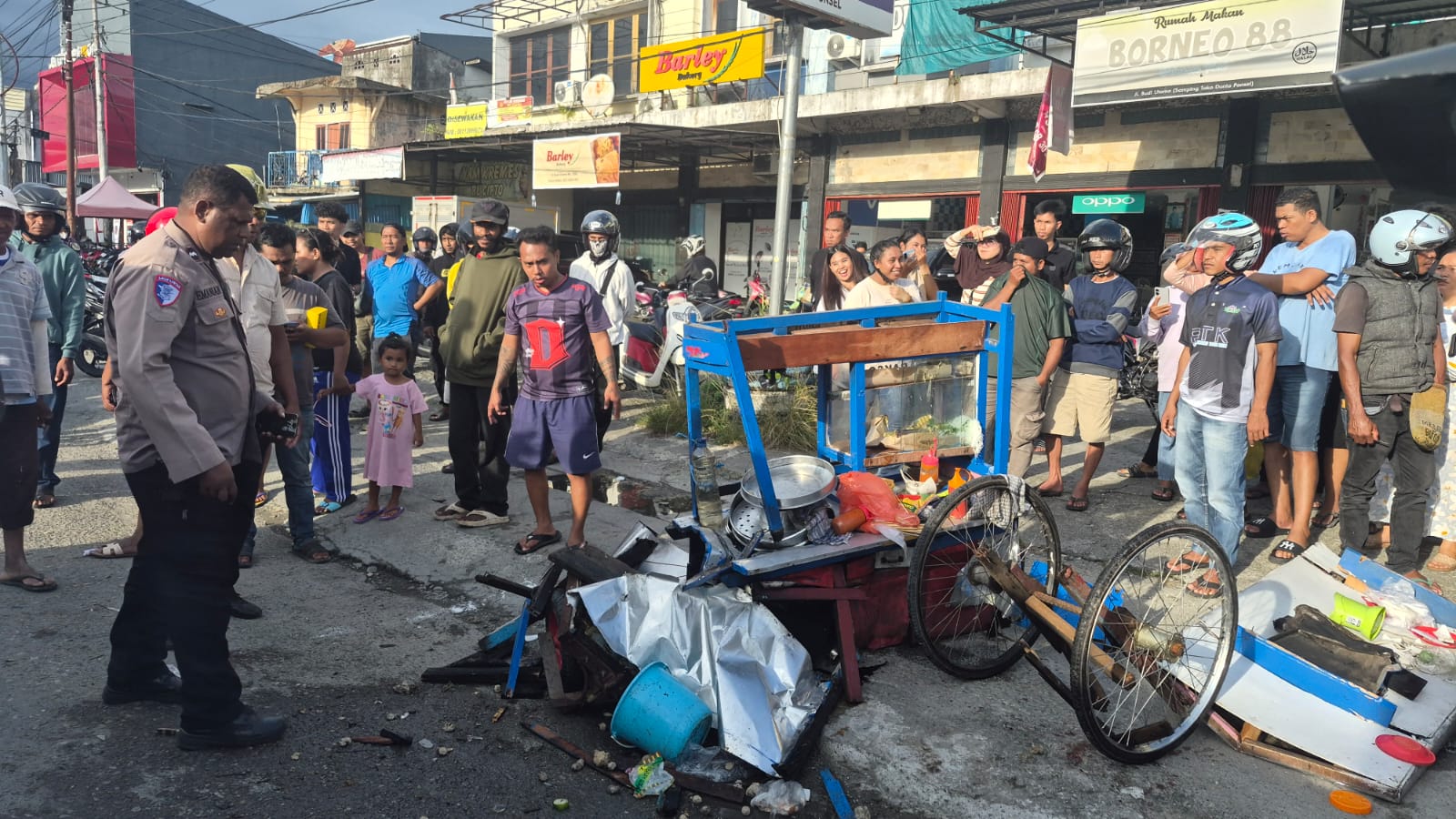 KECELAKAAN – Warga melihat gerobak milik AR yang rusak usai kecelakaan di Jalan Budi Utomo, Mimika, Sabtu (25/4/2026). (Foto: Gren/TimeX)