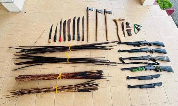 Barang bukti yang diamankan antara lain delapan bilah parang, enam pucuk senapan angin, satu pisau sangkur, sejumlah kapak, serta satu unit telepon genggam yang diduga milik anggota kelompok.