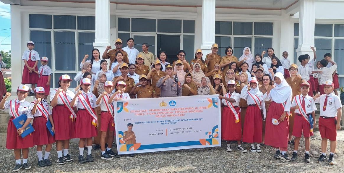 FOTO BERSAMA – Wakapolsek Mimika Baru (Miru), Iptu Muhammad Iqbal Saleh, berfoto bersama para murid SD Inpres IV Timika usai memberikan motivasi dan edukasi tentang pentingnya disiplin, tanggung jawab, serta bahaya perundungan (bullying), pada Senin (27/4/2026). (Foto: Gren/TimeX)