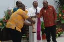 MISA SYUKUR – Uskup Timika, Mgr. Bernardus Bofitwos Baru, OSA, didampingi Pastor Lambert Kopong, Pr., dan Pastor Bobi, Pr, usai memimpin misa syukur perayaan Imlek 2577 Kongzili 2026 di Gereja Imanuel Mapurujaya, Minggu (1/3/2026). (FOTO:MAURITS/TIMEX)